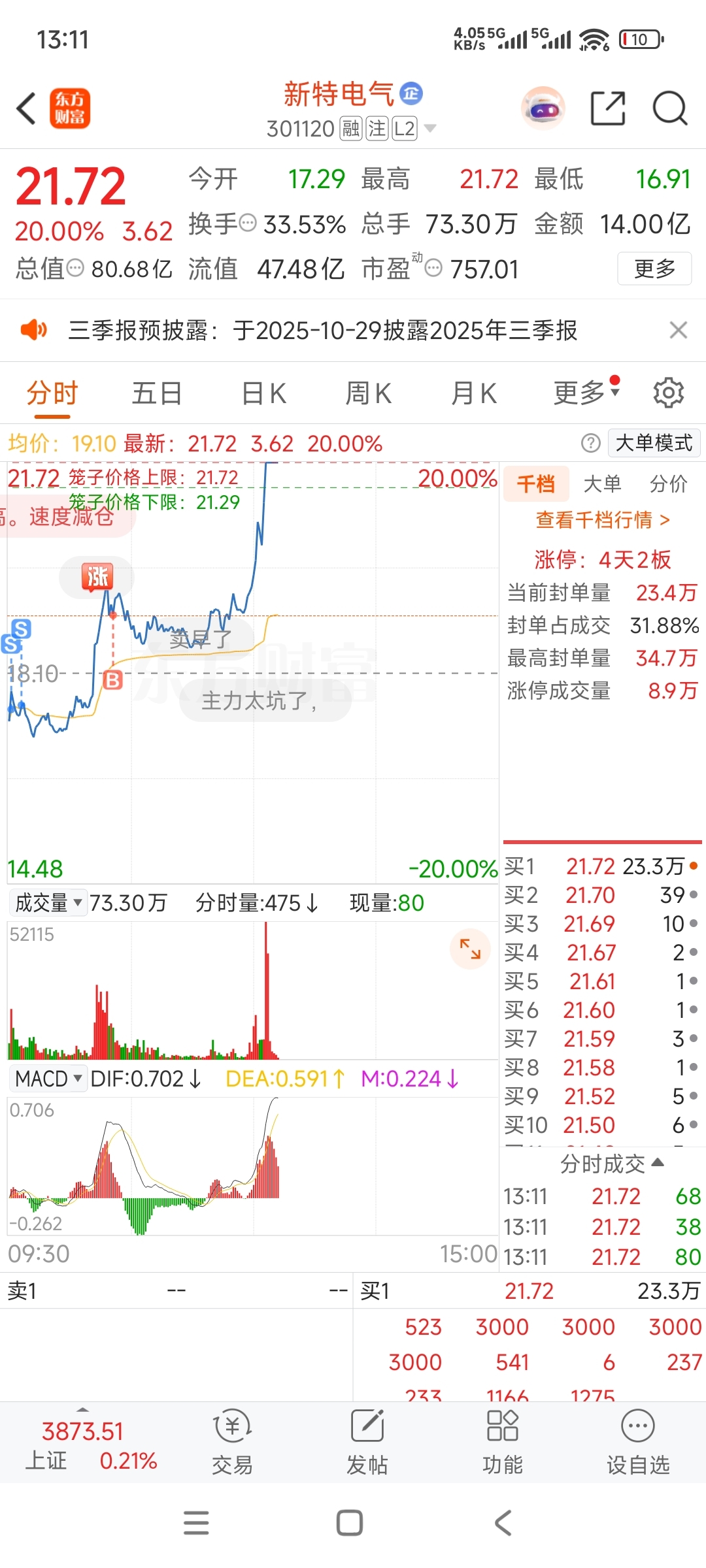 $新特电气(SZ301120)$ 这个股真搞心态,早上低点卖了,中间又买回来了,十几个点的利润没有了