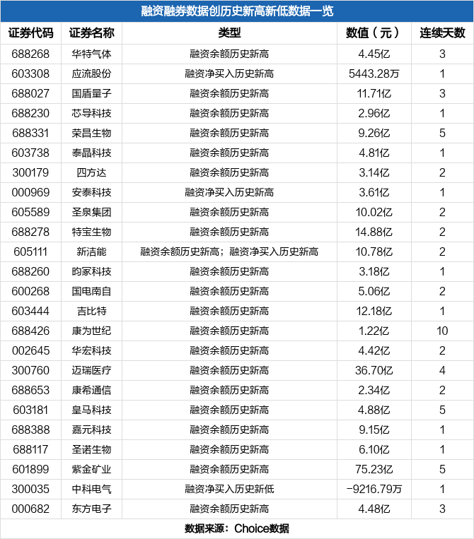 10月15日沪深两市共有124只股票两融数据创历史新高/新低,部分数据如下: