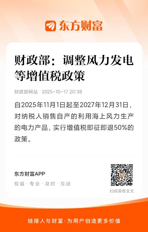 一、自2025年11月1日起至2027年12月31日,对纳税人销售自产的利用海上风力生产的电力产品,实行增值税即征即退50%的政策。