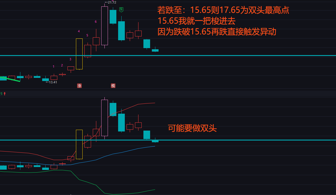 不排除要做双头,如果跌至20日均线,双头的高点是18.13,若跌至15.65则双头的高点是17.65