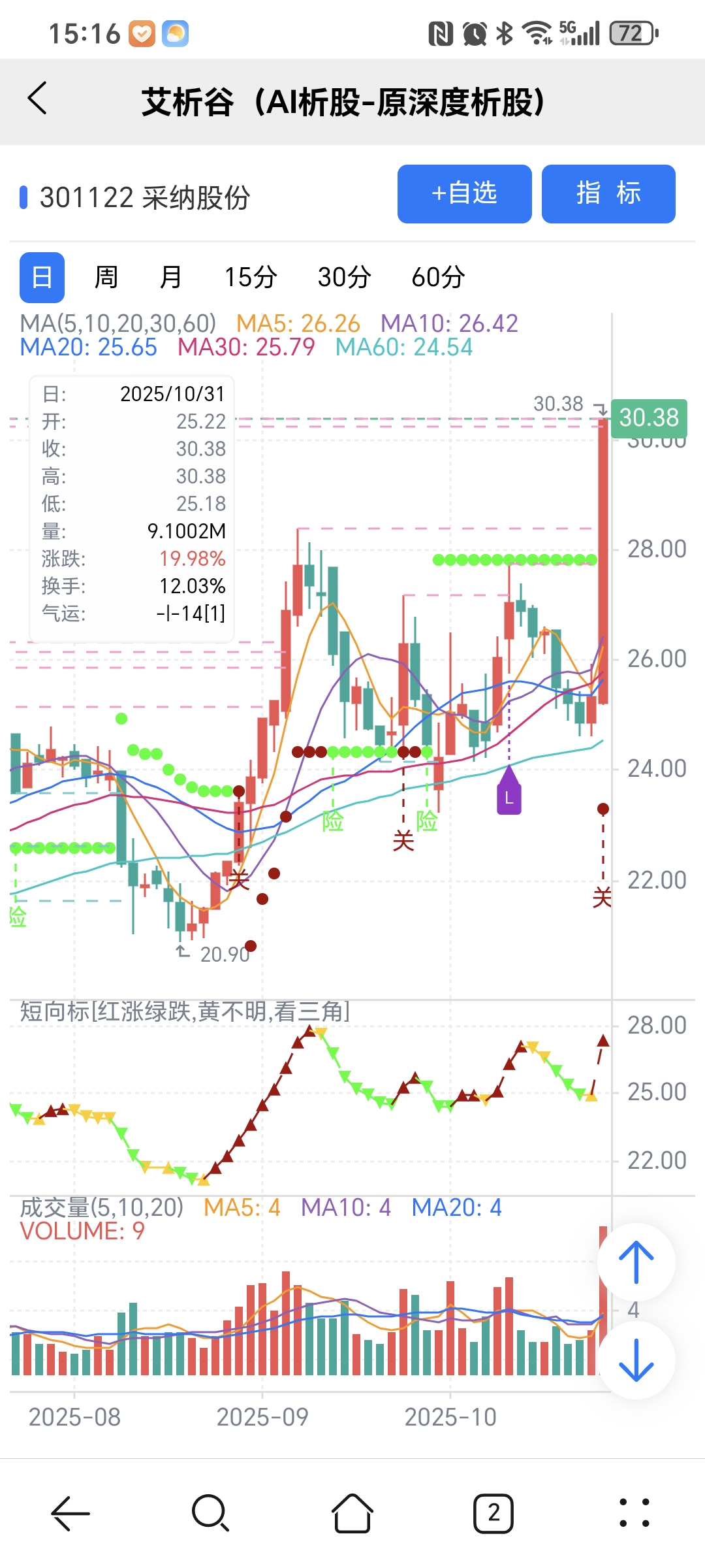 红绿小圆点是艾析谷的量化指标-超级短趋线,是趋势跟踪+突破类的量化指标,完全免费。