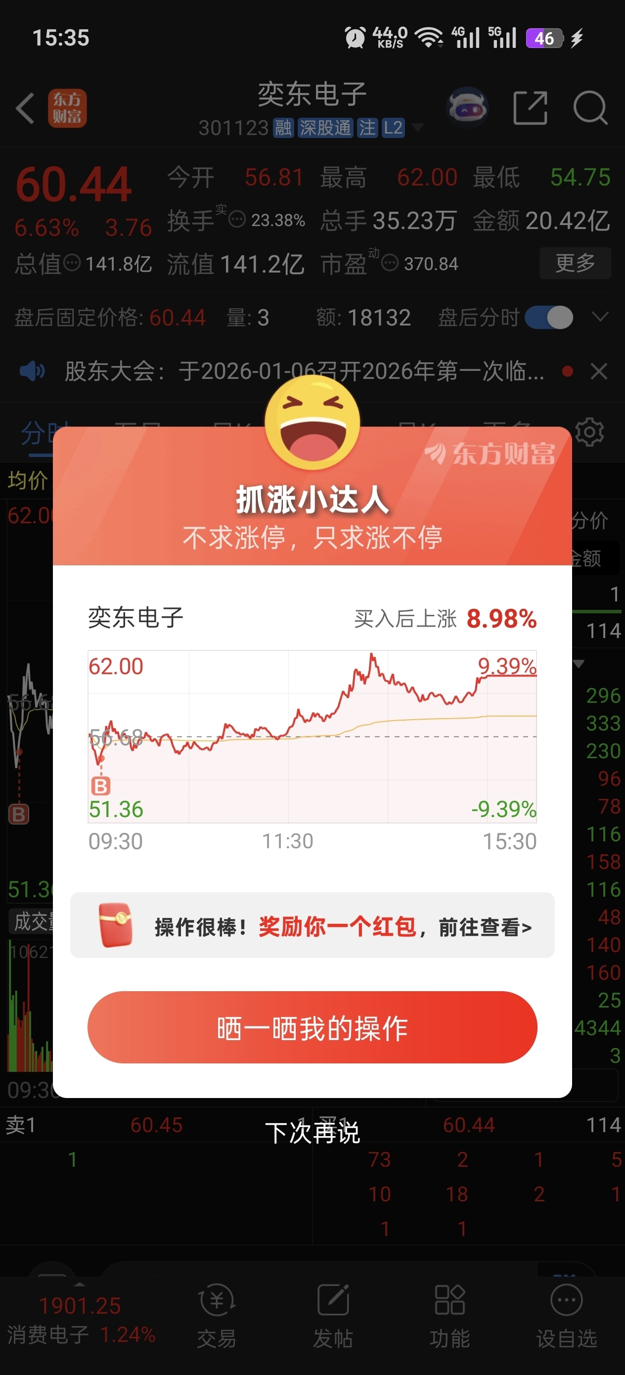 奕东电子今天早盘随便买的,位置不错,虽然现在涨了不少,但是好股永远不畏高