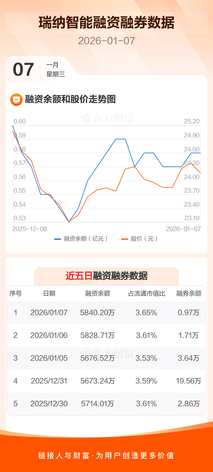 交易所最新数据显示,瑞纳智能于2026年1月7日获融资买入439.99万元,融资偿还428.50万元,当日融资净买入11.48万元。目前,该股融资余额5840.20万,占流通市值比例为3.65%。