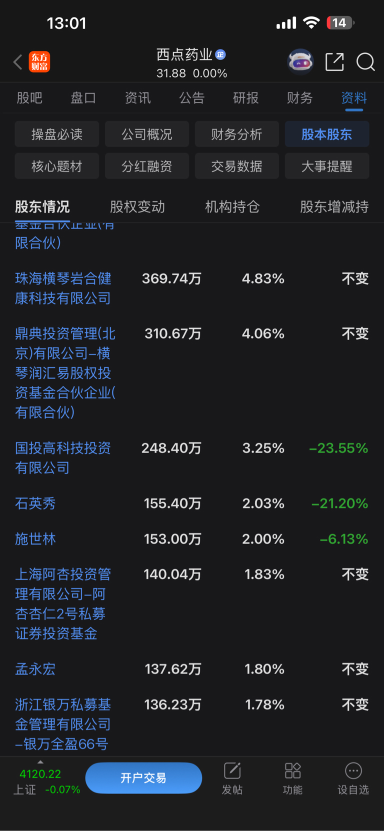 $西点药业(SZ301130)$ 山顶票就是这样来回对到出货,只要哪天微盘板块不行了,这种票直接45度角向下绝对不带抬头的,连涨几个星期了,要不是有回购利好加上微盘强势,这种票早就应该补跌了,在里面的股东全逃命了,知道东北票不能玩