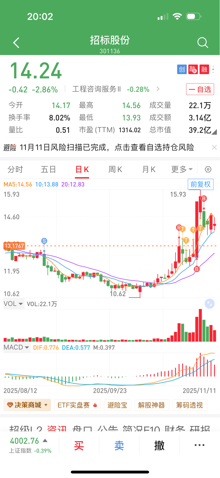 $招标股份(SZ301136)$ 今天不适合t 不知道主力什么套路!底仓留着!感觉行情没走完
