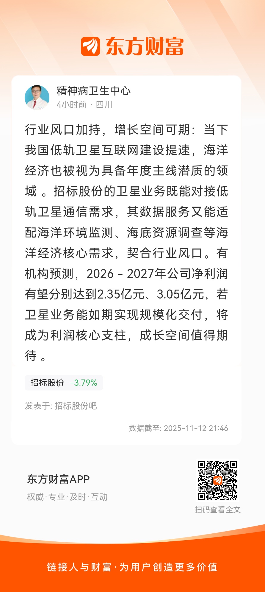 行业风口加持,增长空间可期:当下我国低轨卫星互联网建设提速,海洋经济也被视为具备年度主线潜质的领域 。招标股份的卫星业务既能对接低轨卫星通信需求,其数据服务又能适配海洋环境监测、海底资源调查等海洋经济核心需求,契合行业风口。有机构预测,2026 - 2027年公司净利润有望分别达到2.35亿元、3.05亿元,若卫星业务能如期实现规模化交付,将成为利润核心支柱,成长空间值得期待 。