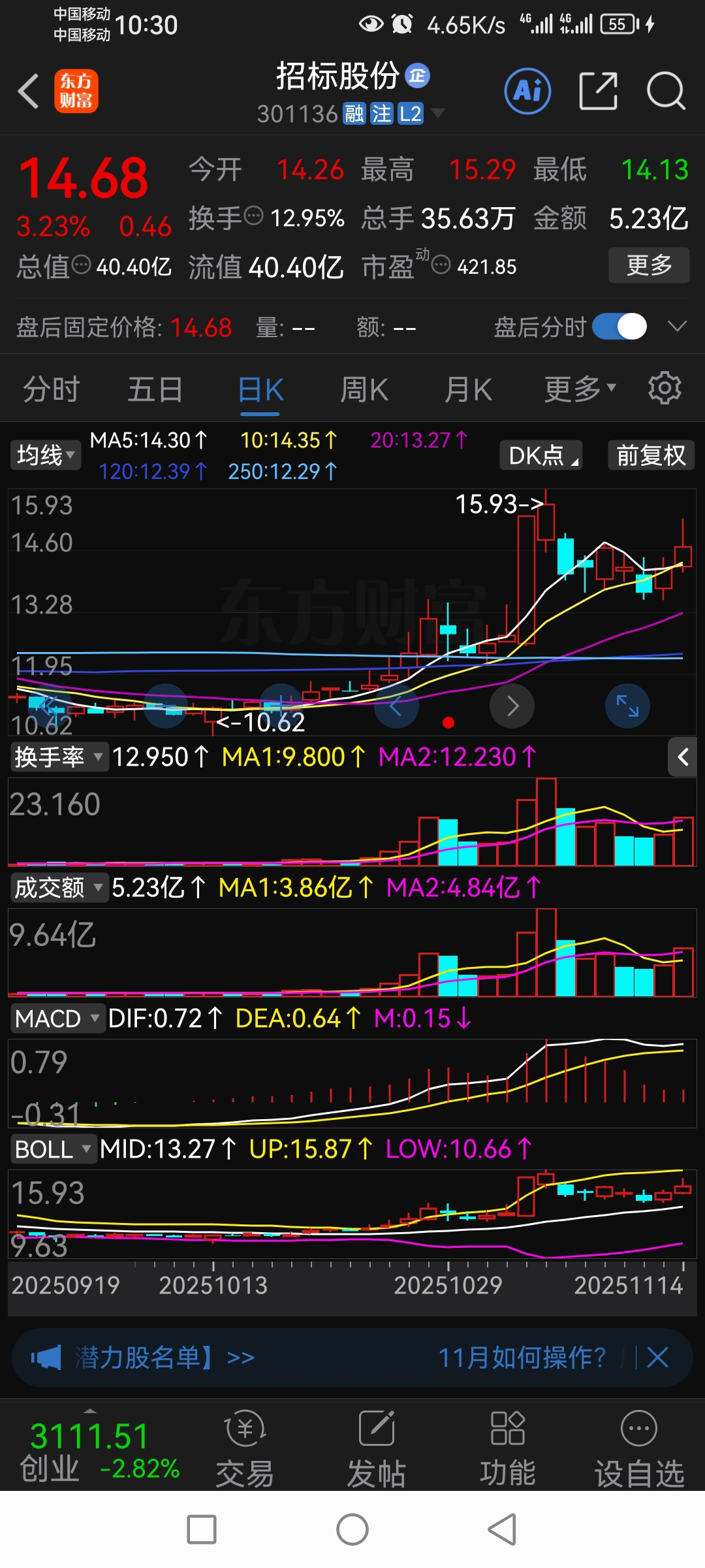 $招标股份(SZ301136)$ 公司基本面没有潜在爆雷风险 ,K线图呈现U型右侧突破趋势,但时间还不够(通常要9到12天)星期一近期妖王合富中国停牌交易,压力给到了平潭发展和海峡创新(两个都还没有出监控期)下星期开盘应密切关注两股的表现,预期福建板块要到下星期三(两大龙头移出监控)才能启动新一轮向上进攻行情,与招标股份启动时间敏和