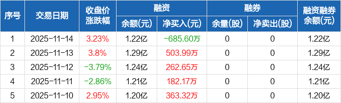 融资方面,当日融资买入5191.47万元,融资偿还5877.06万元,融资净偿还685.6万元。融券方面,融券卖出0股,融券偿还0股,融券余量0股,融券余额0元。融资融券余额合计1.22亿元。