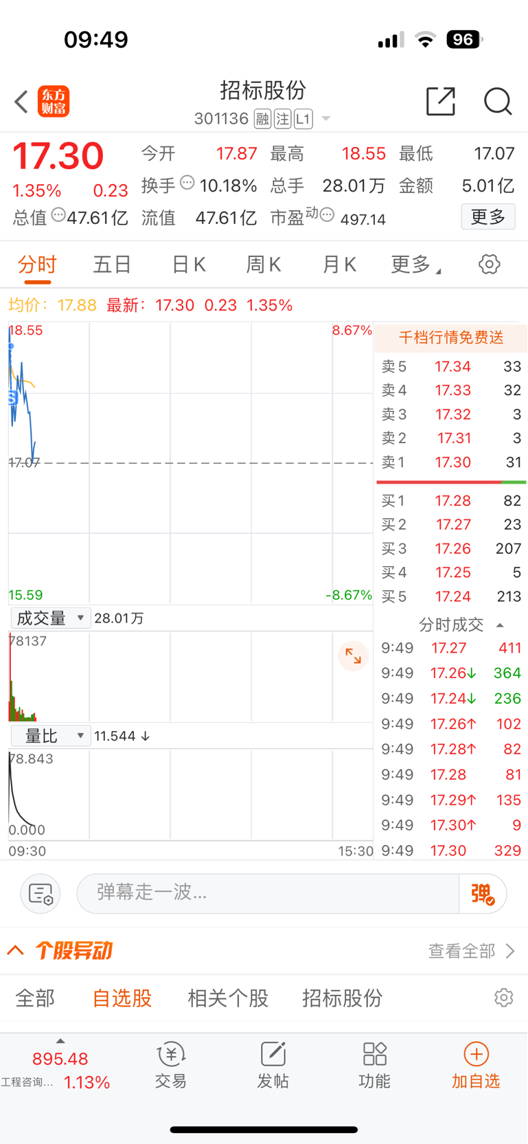 $招标股份(SZ301136)$ 闪人~冲不上就是冲不上