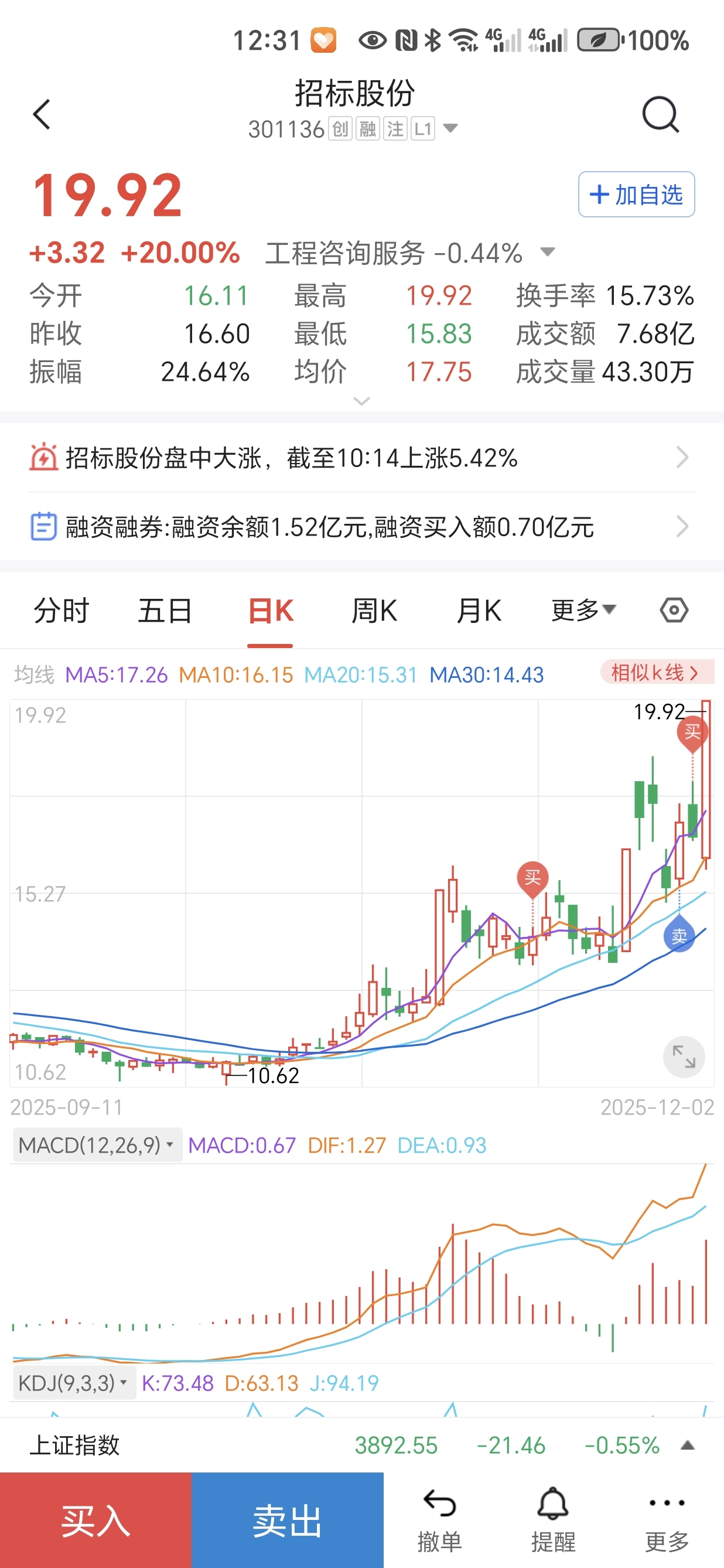 $招标股份(SZ301136)$ 居然成功做了一次短线,周五卖出,周一看这货回调果断买回,今日来了个大长腿,当然主要还是坚定认为这票应该是还有戏!