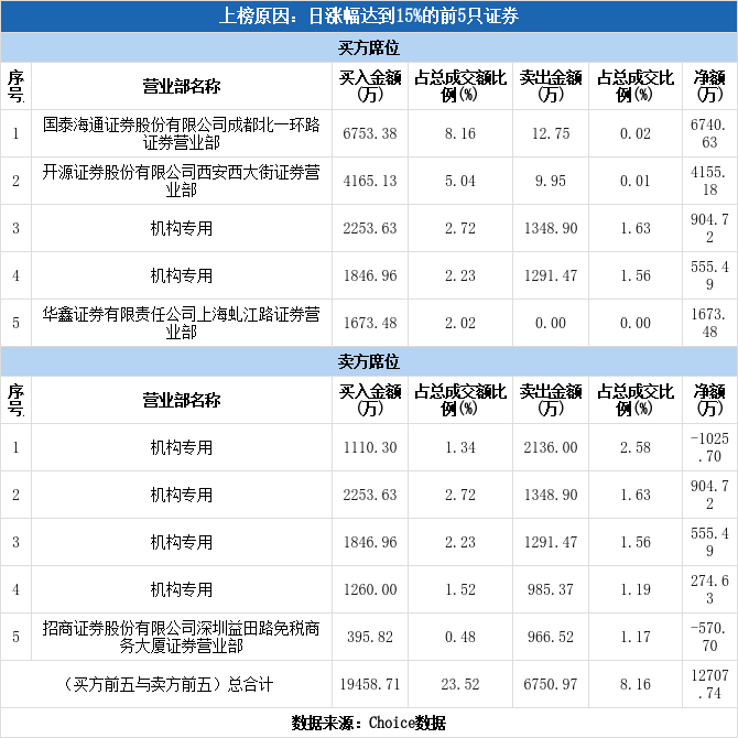 龙虎榜数据显示,今日共6个机构席位出现在龙虎榜单上,分别位列买三、买四、卖一、卖二、卖三、卖四,合计净买入709.15万元,占龙虎榜净买额的5.58%。除此之外还有航天发展、顺灏股份、国风新材等34只个股榜单上出现了机构的身影,其中19家呈现机构净买入,获净买入最多的是航天发展,净买额为1.67亿元;15家呈现机构净卖出,其中遭净卖出最高的为招商轮船,净卖额为9998.98万元。