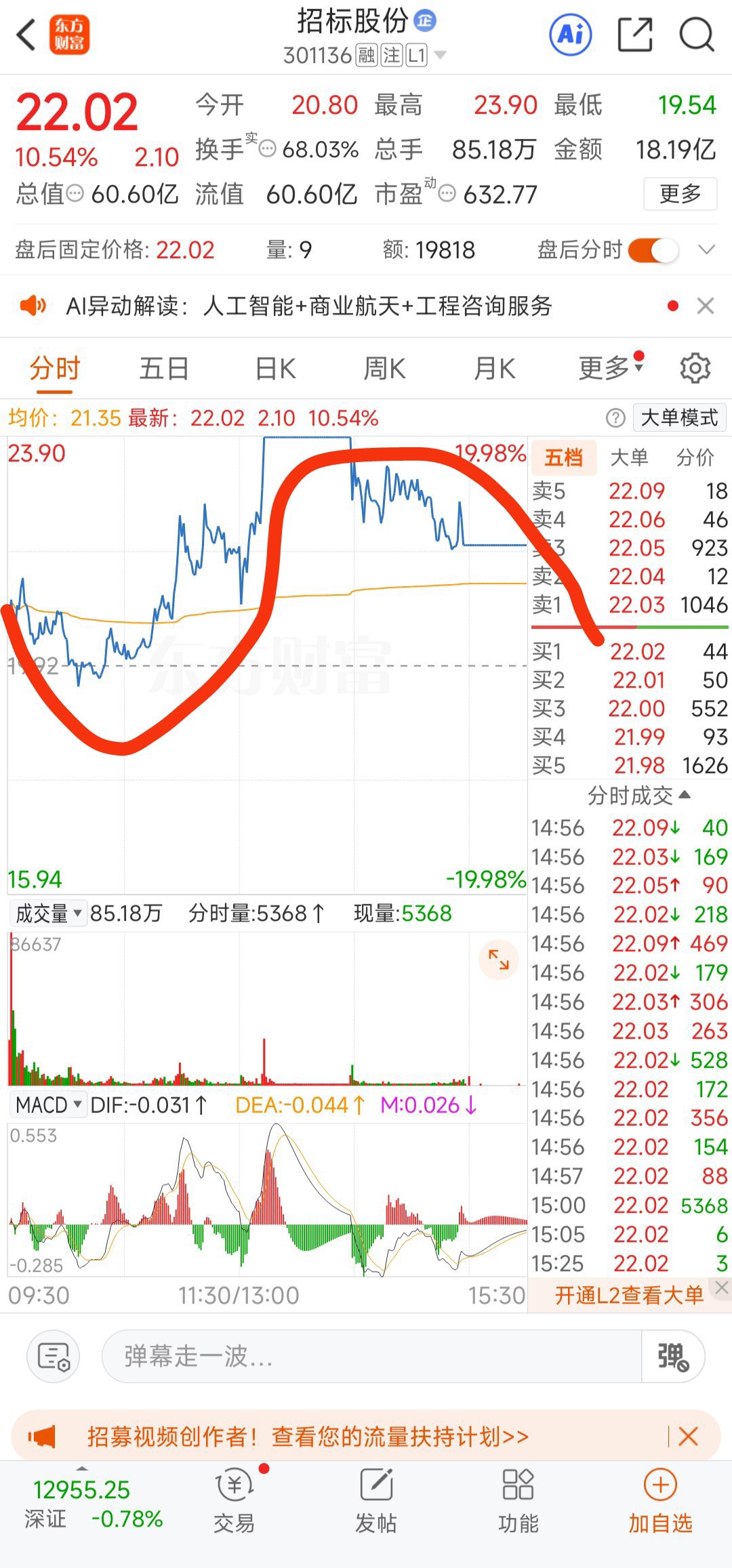 $招标股份(SZ301136)$ 量化主力关联团队操作的s分时走势就是坑人!远离量化S分时走势