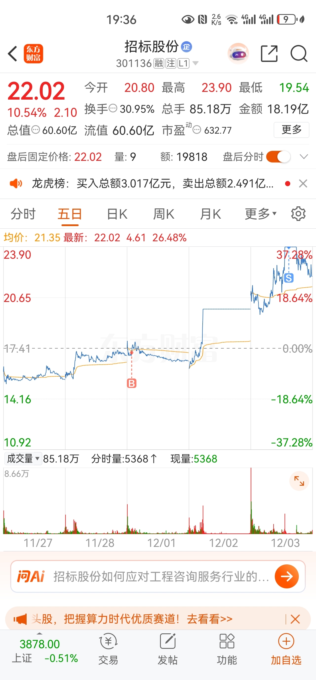 $招标股份(SZ301136)$