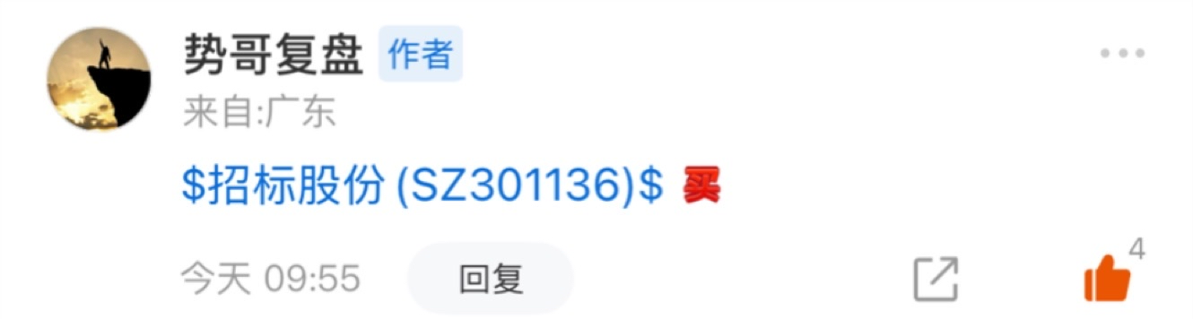 $招标股份(SZ301136)$ 早盘竞价有明显的承接果断入场、行情不好不代表我的战绩就不行!