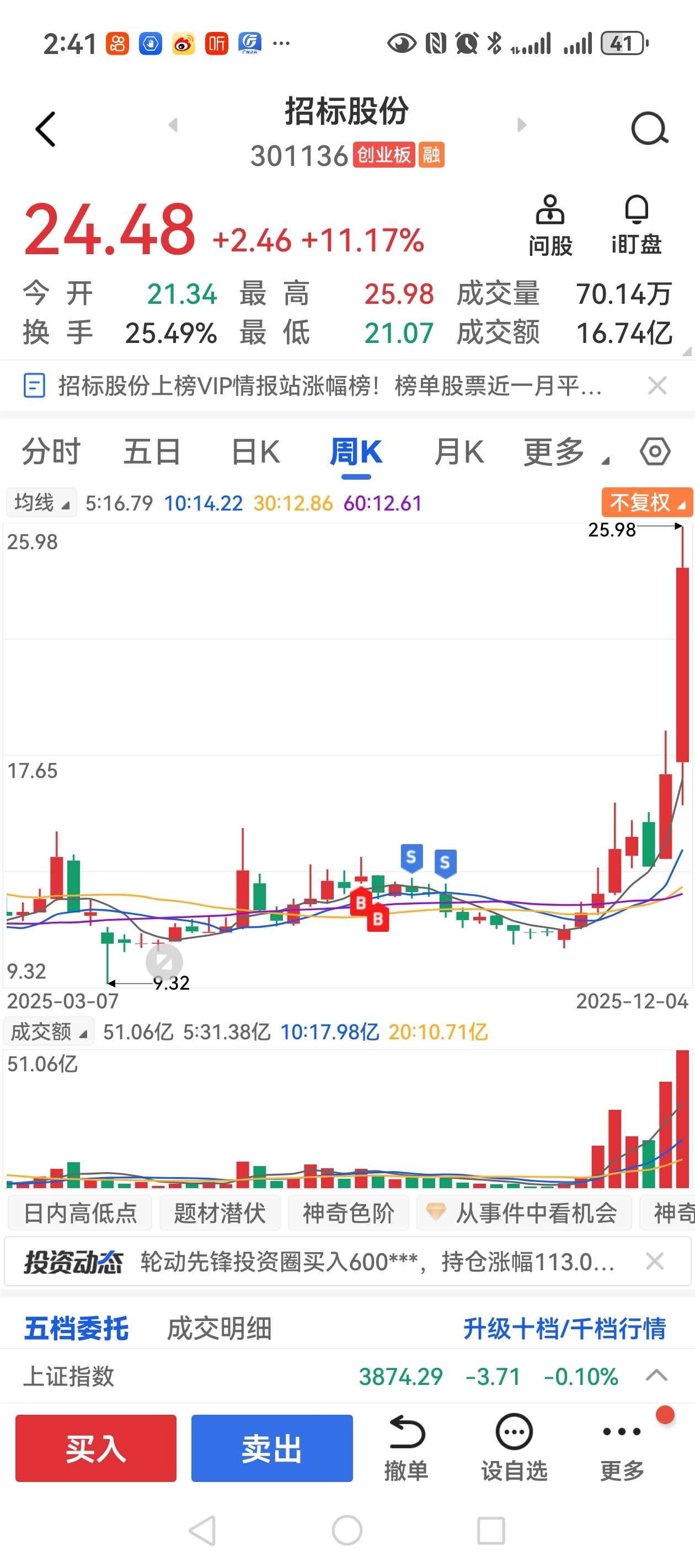 $招标股份(SZ301136)$ 哎呦喂8月份赔钱走的,今天一看翻翻了