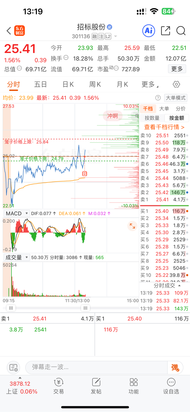 $招标股份(SZ301136)$ 明少买入招标股份,止盈实达。