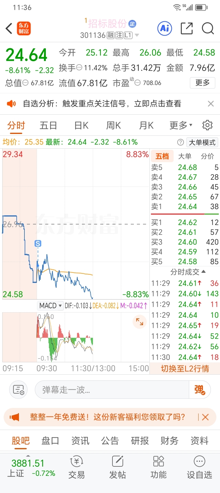 $招标股份(SZ301136)$ 昨天进来的,赚了几个点,今天直接大低开导致亏损,没办法,割肉还是要果断要及时。
