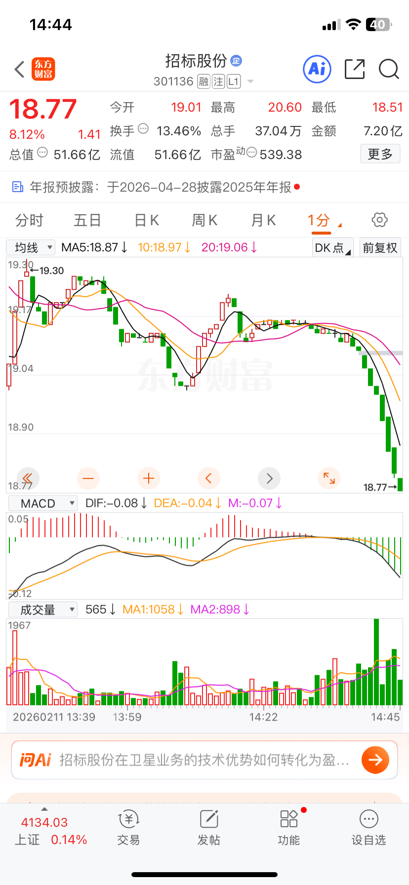 $招标股份(SZ301136)$ 看看这一分钟的k线!没底了,一直跌!