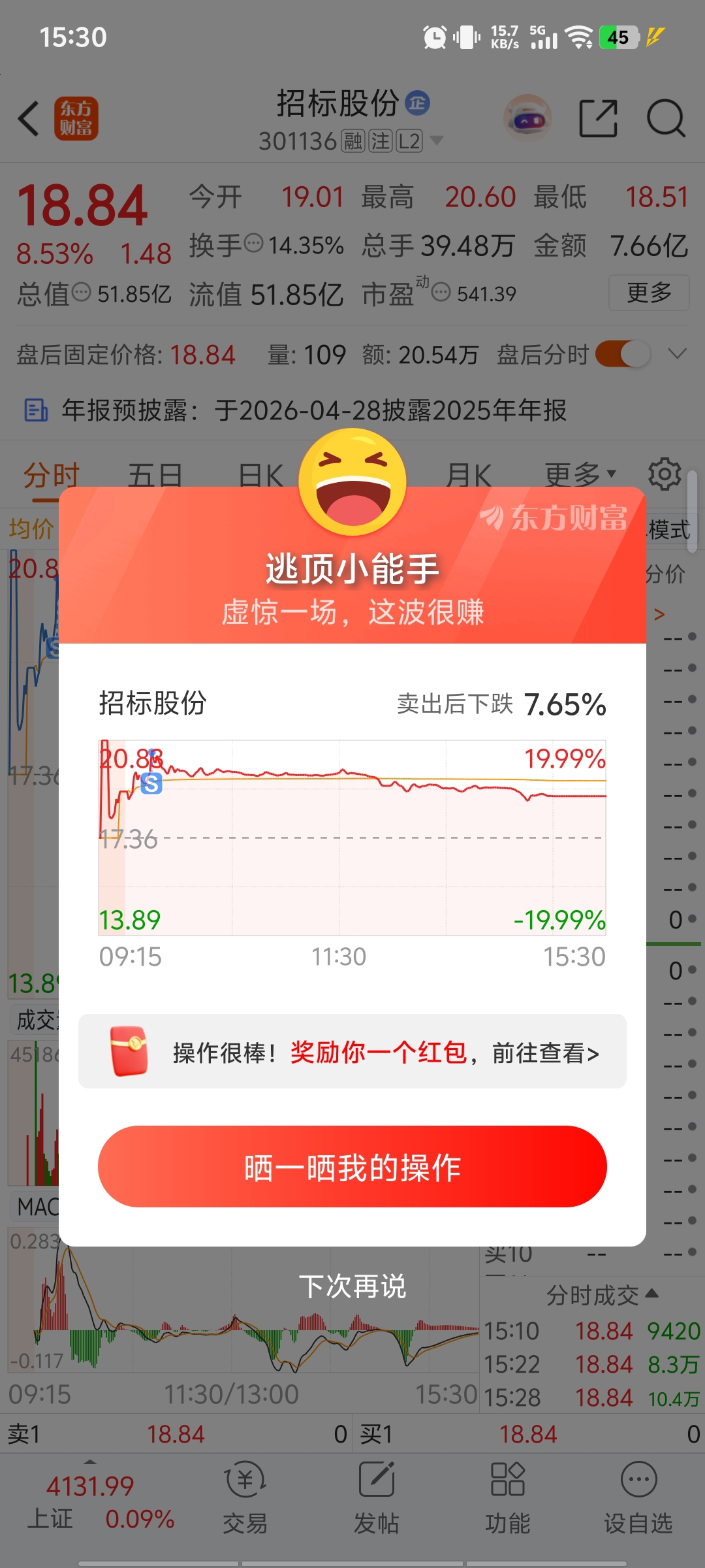 $招标股份(SZ301136)$ 可惜昨天减仓了不然今天总收益至少8个点