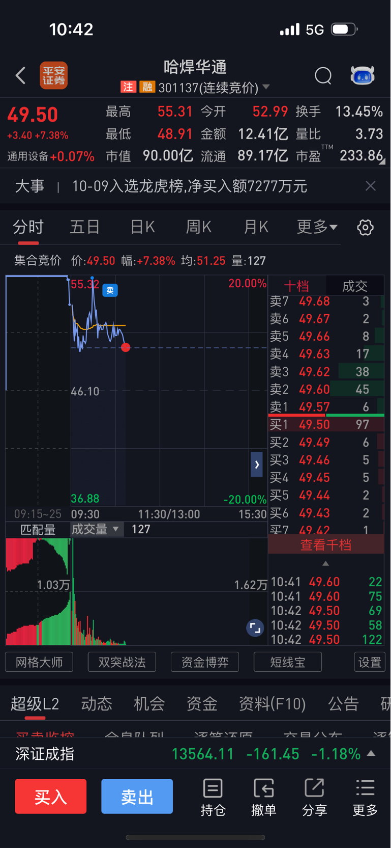 $哈焊华通(SZ301137)$ 凭运气挣钱,昨天45.3追进来,今天8点起床挂单55.3跑了