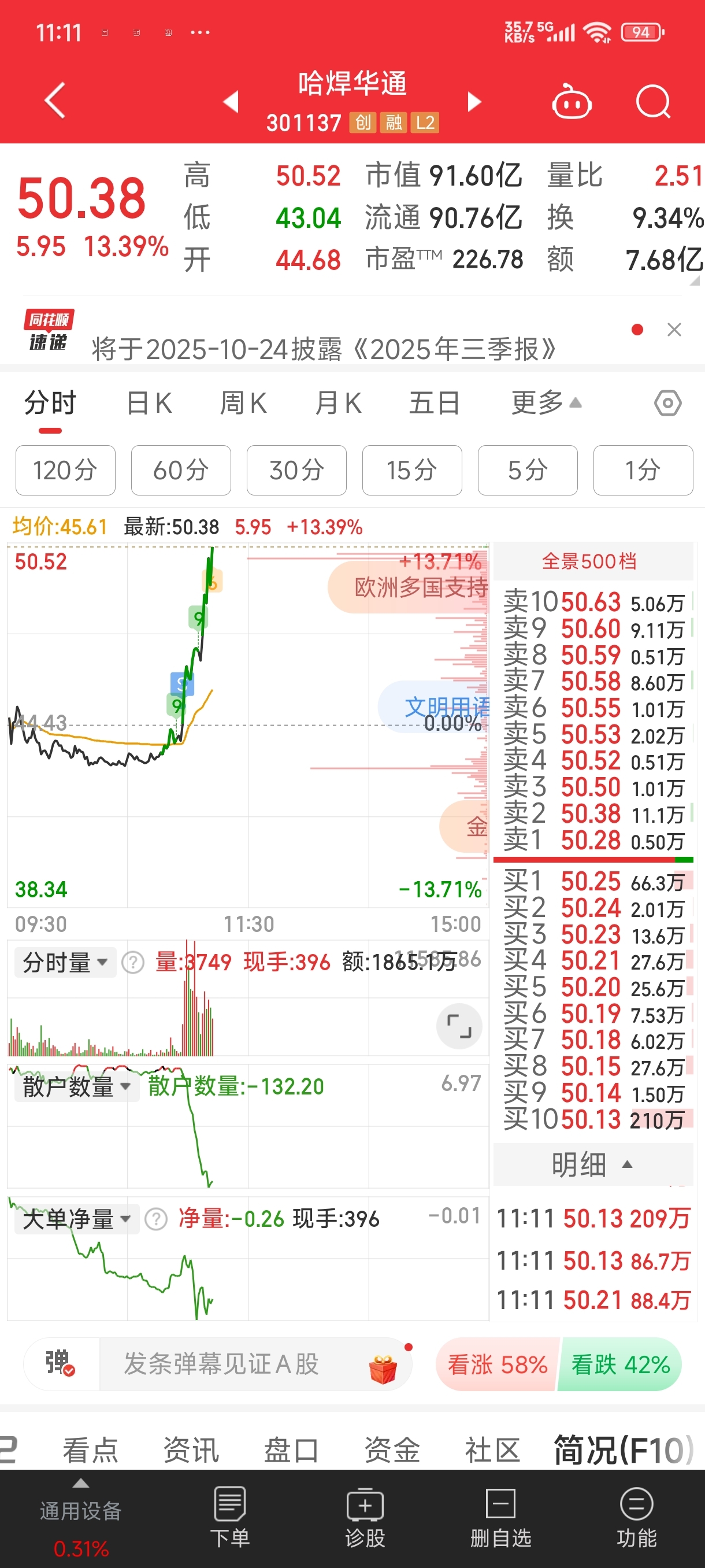 $哈焊华通(SZ301137)$ 50卖了,卖飞