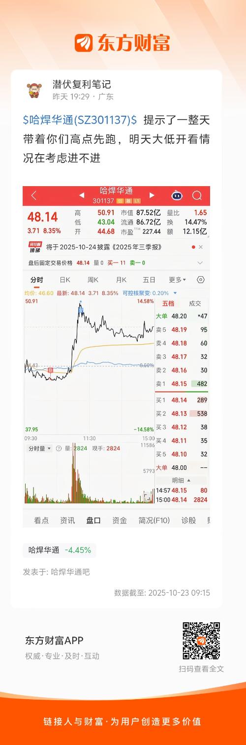 $哈焊华通(SZ301137)$  提示了一整天带着你们高点先跑,明天大低开看情况在考虑进不进