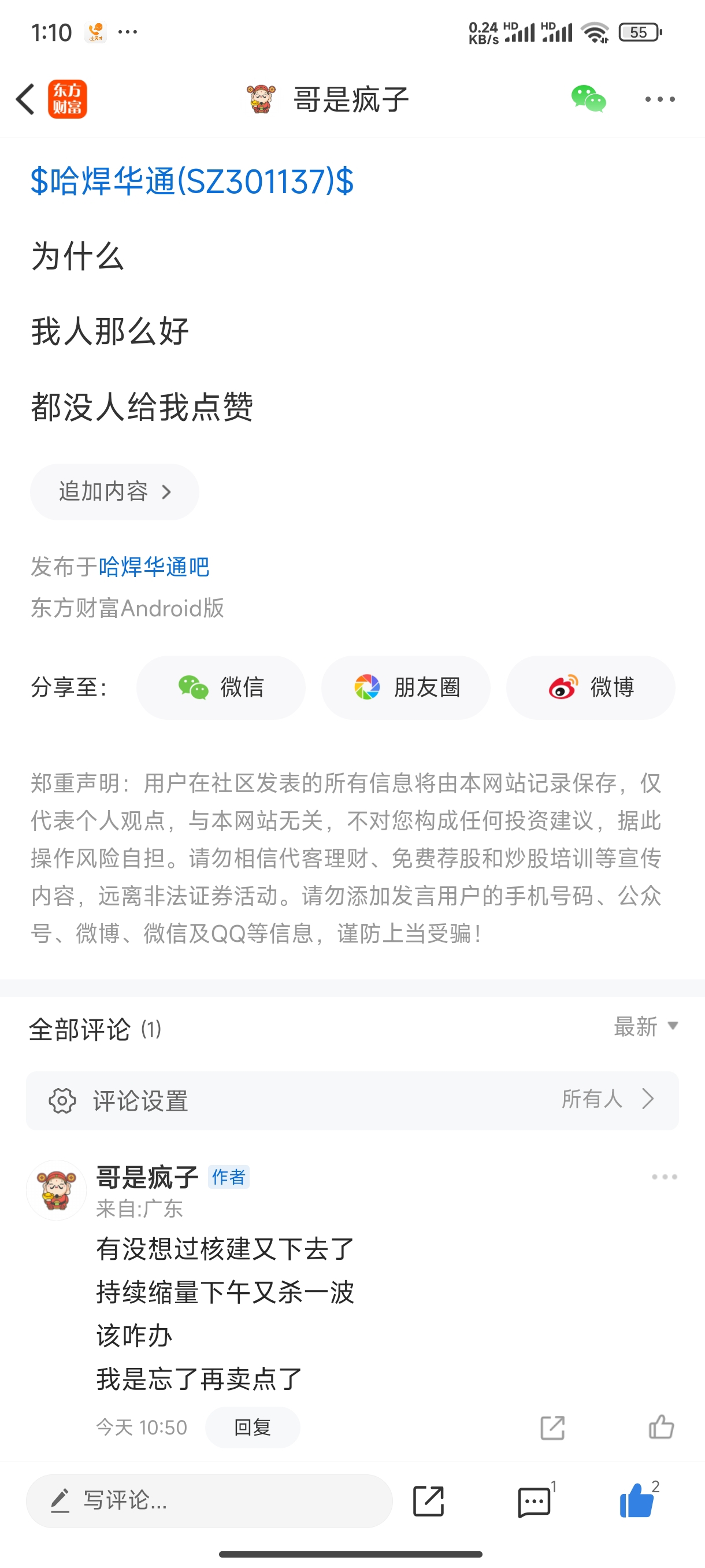 温馨提示: 1.根据《证券法》规定,禁止编造、传播虚假信息或者误导性信息,扰乱证券市场;2.用户在本社区发表的所有资料、言论等仅代表个人观点,与本网站立场无关,不对您构成任何投资建议。用户应基于自己的独立判断,自行决定证券投资并承担相应风险。《东方财富社区管理规定》