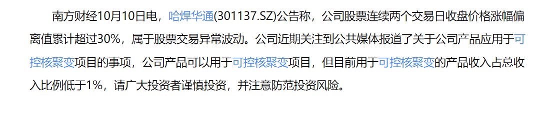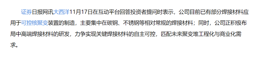 哈焊华通在可控核聚变的产品收入只占总收入的不足1%,真正可控核聚变焊材龙头是大西洋,哈焊华通三季报净利润连大西洋的零头都不到