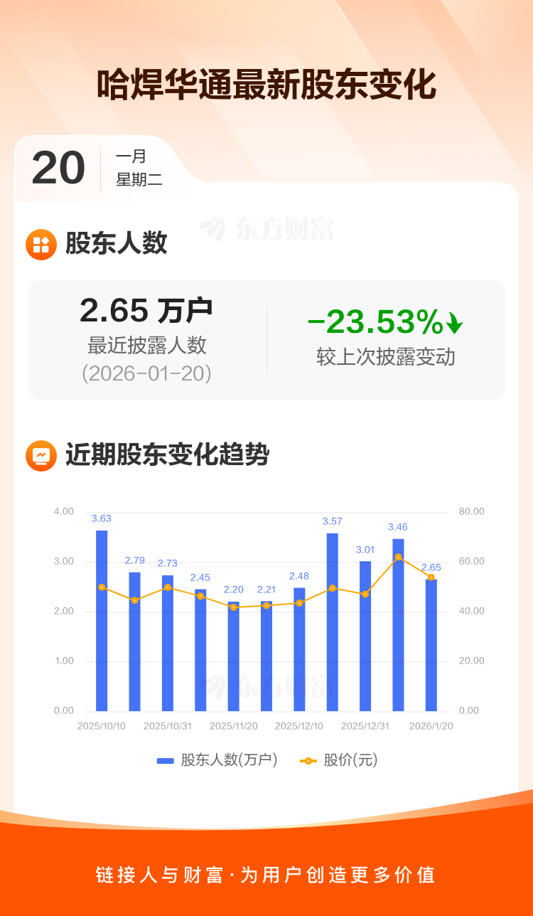 哈焊华通:截至1月20日最新股东户数2.65万户,较上期减少23.53%