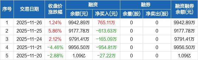 华研精机:融资净买入765.11万元,融资余额9942.89万元(11-26)