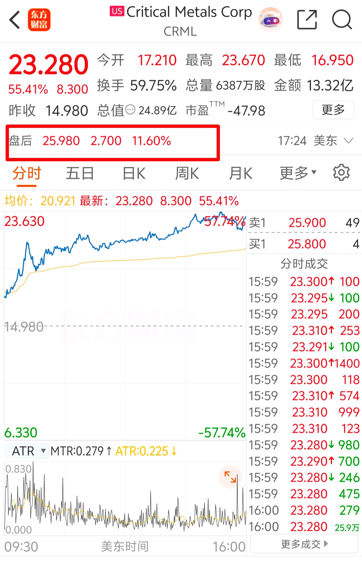 美稀土概念收盘股暴涨55%,盘后又继续拉升12%!累及已经暴涨百分之七十多了!