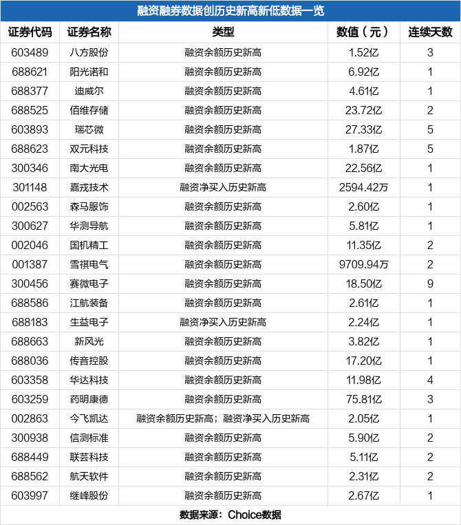12月2日沪深两市共有89只股票两融数据创历史新高/新低,部分数据如下: