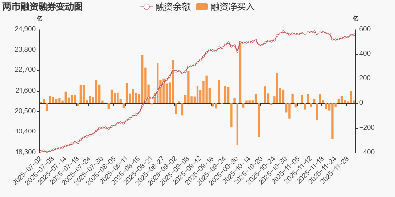 12月2日,沪指下跌0.42%,报收3898点。最新数据显示,当日末沪深两市融资余额2.46万亿元,较前一交易日增加22.11亿元;两市融资余额连续6日增加,累计265.95亿元。两市融券余额175.51亿元,较前一交易日减少5101.5万元。两市融资融券余额2.49万亿元,较前一交易日增加21.43亿元。