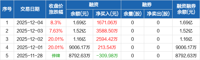 融资方面,当日融资买入7401.48万元,融资偿还5730.41万元,融资净买入1671.06万元,连续4日净买入累计8067.52万元。融券方面,融券卖出0股,融券偿还0股,融券余量0股,融券余额0元。融资融券余额合计1.69亿元。