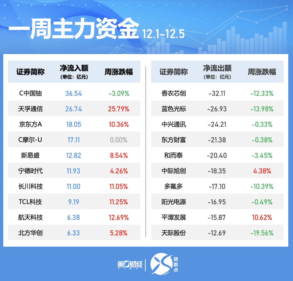 个股方面,本周C中国铀、天孚通信、京东方A获主力净流入居前,分别为36.54亿元、26.74亿元、18.05亿元;净流出方面,香农芯创、蓝色光标、中兴通讯遭主力净流出居前,分别为32.11亿元、26.93亿元、24.21亿元。