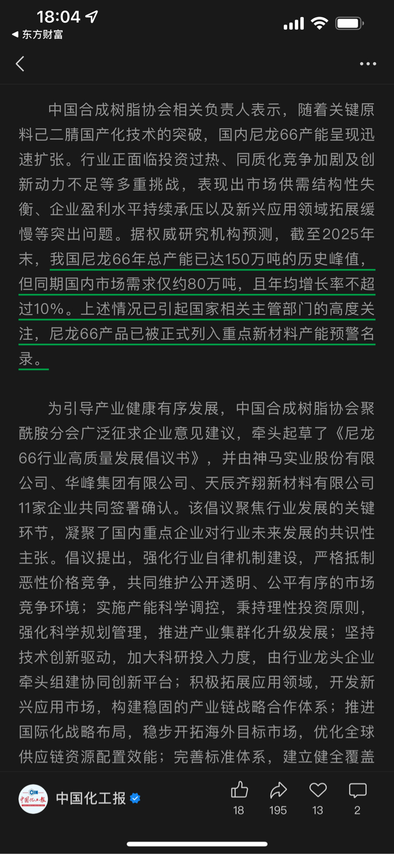 $隆华新材(SZ301149)$ ,我国尼龙66年总产能已达150万吨的历史峰值,但同期国内市场需求仅约80万吨,且年均增长率不超过10%。上述情况已引起国家相关主管部门的高度关注,尼龙66产品已被正式列入重点新材料产能预警名录。