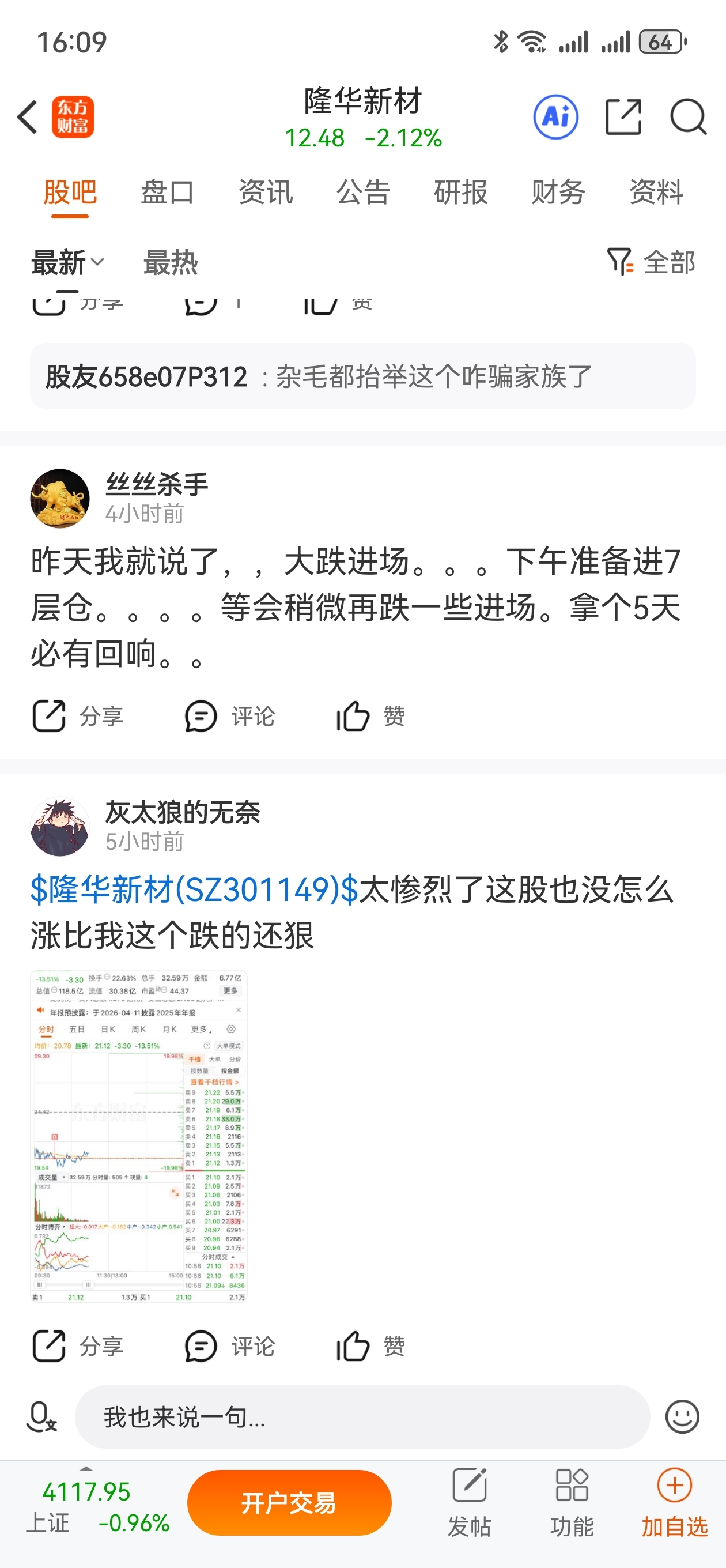$隆华新材(SZ301149)$ 下午挂买单一个没成交。。。主力也逛评论区吗??哎,和这个没缘分了,,,我去万向德农了。。。。。,星期一继续追万向。。。。。。