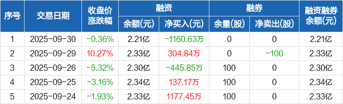中一科技:融资净偿还1160.63万元,融资余额2.21亿元(09-30)