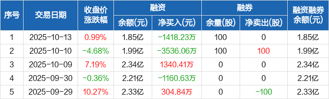中一科技:融资净偿还1418.23万元,融资余额1.85亿元(10-13)