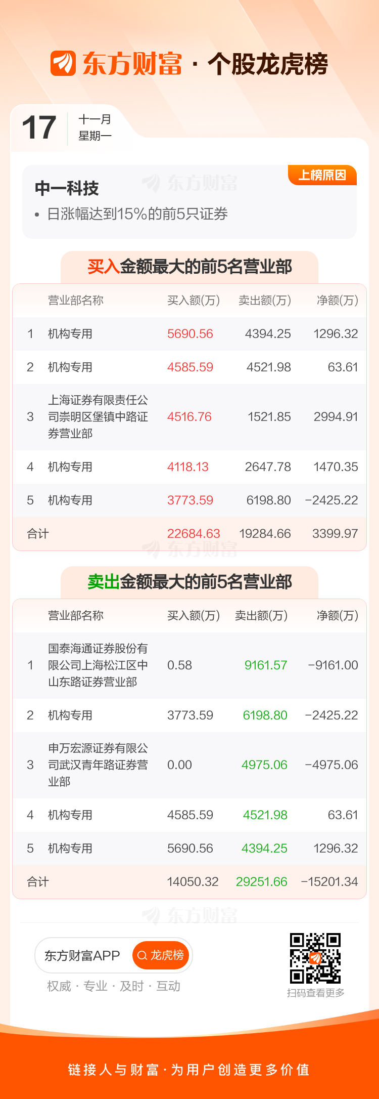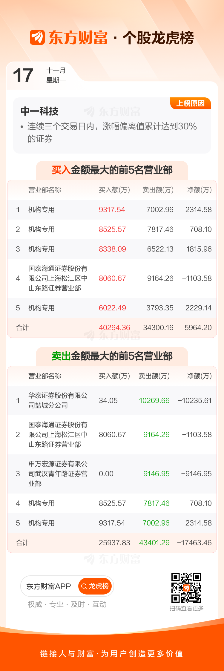 交易所2025年11月17日公布的交易公开信息显示,中一科技因成为日涨幅达到15%的前5只证券、连续三个交易日内,涨幅偏离值累计达到30%的证券上榜。中一科技当日收报62.74元,涨跌幅20.01%,偏离值20.00%,换手率15.42%,成交额20.07亿。异常期间11月14日至11月17日,期间涨幅44.00%,累计偏离值45.79%,区间成交额33.76亿。
