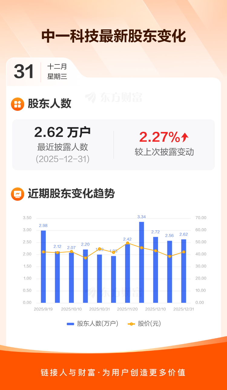 中一科技:截至12月31日最新股东户数2.62万户,较上期增加2.27%