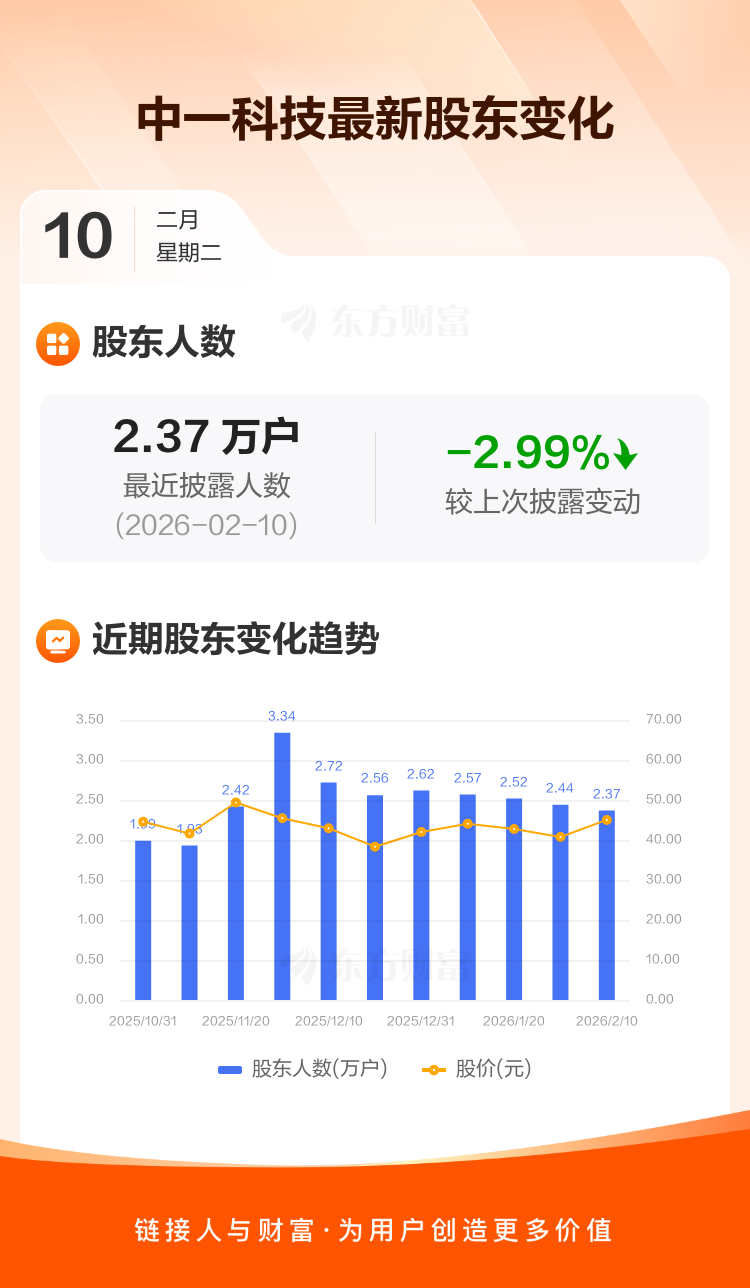 中一科技最新披露数据显示,截至2月10日公司股东户数为2.37万户,较上期(2026年1月30日)减少729户,降幅为2.99%。户均持有流通股数量由上期的9126股上升至9408股,户均持股金额由上期的37.20万元增加至42.36万元。