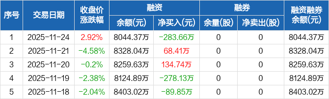 冠龙节能:融资净偿还283.66万元,融资余额8044.37万元(11-24)
