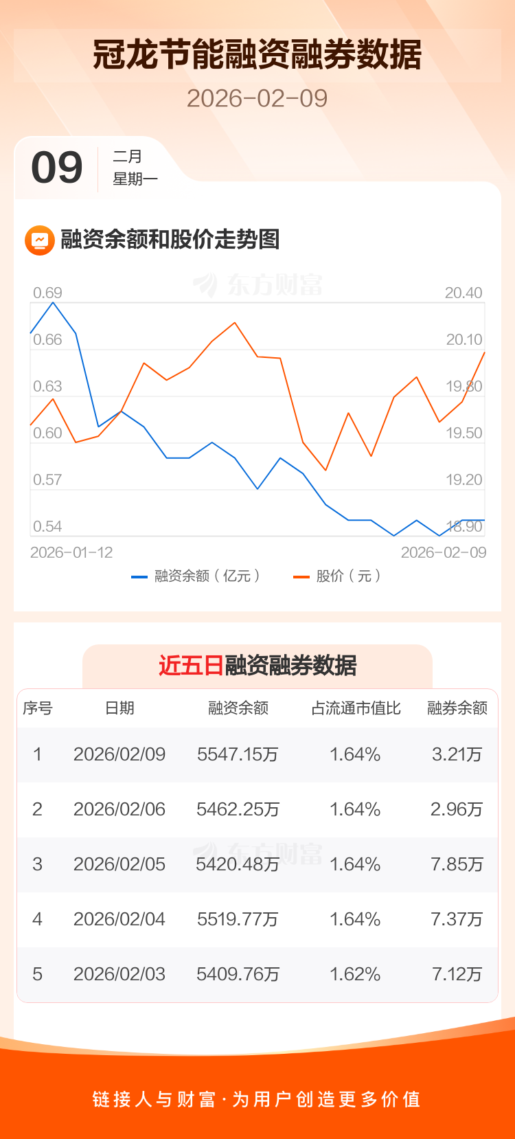 交易所最新数据显示,冠龙节能于2026年2月9日获融资买入540.50万元,融资偿还455.60万元,当日融资净买入84.9万元。目前,该股融资余额5547.15万,占流通市值比例为1.64%。