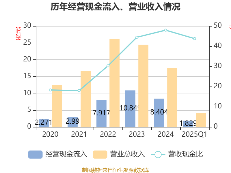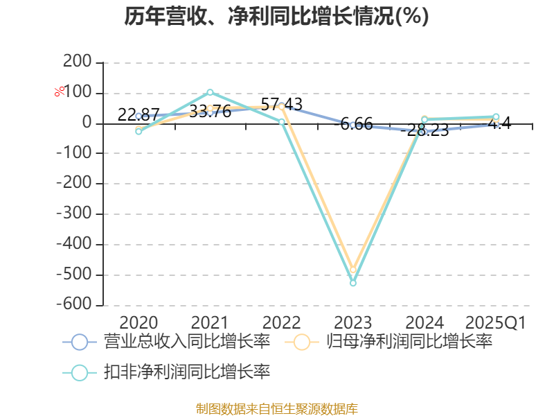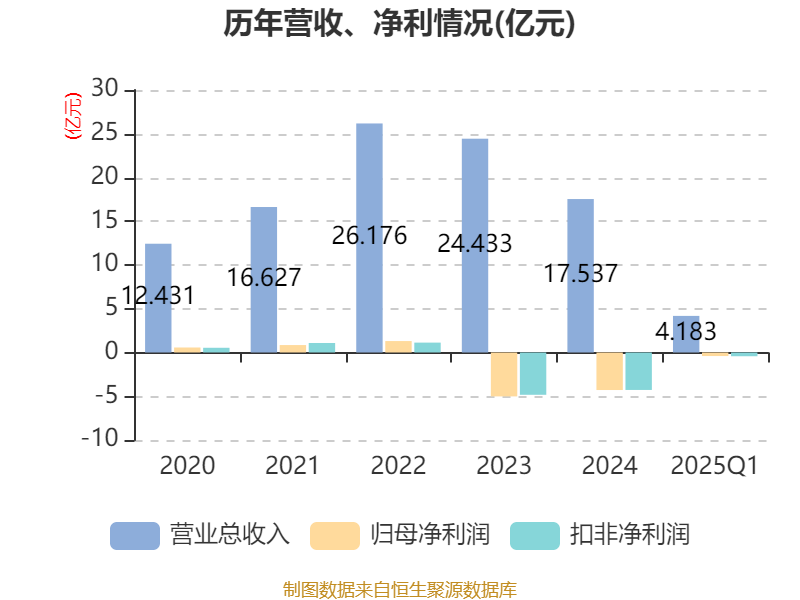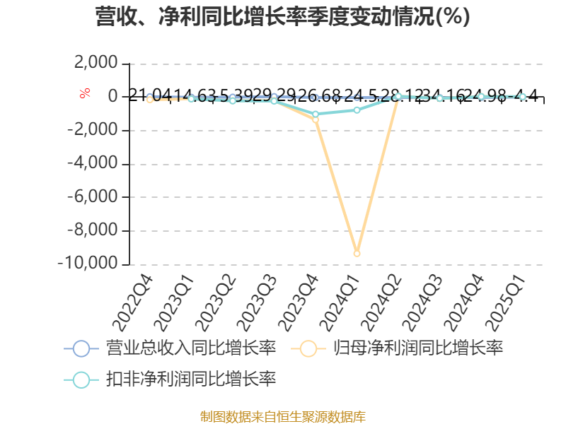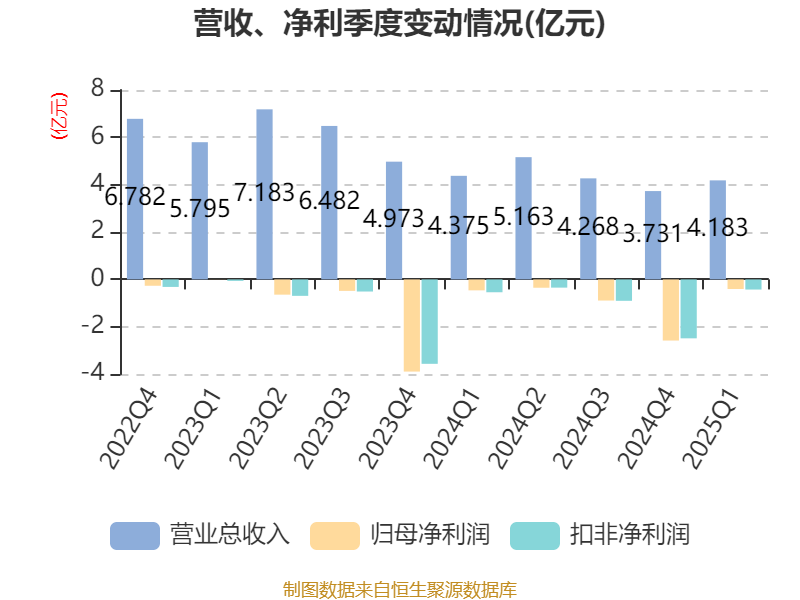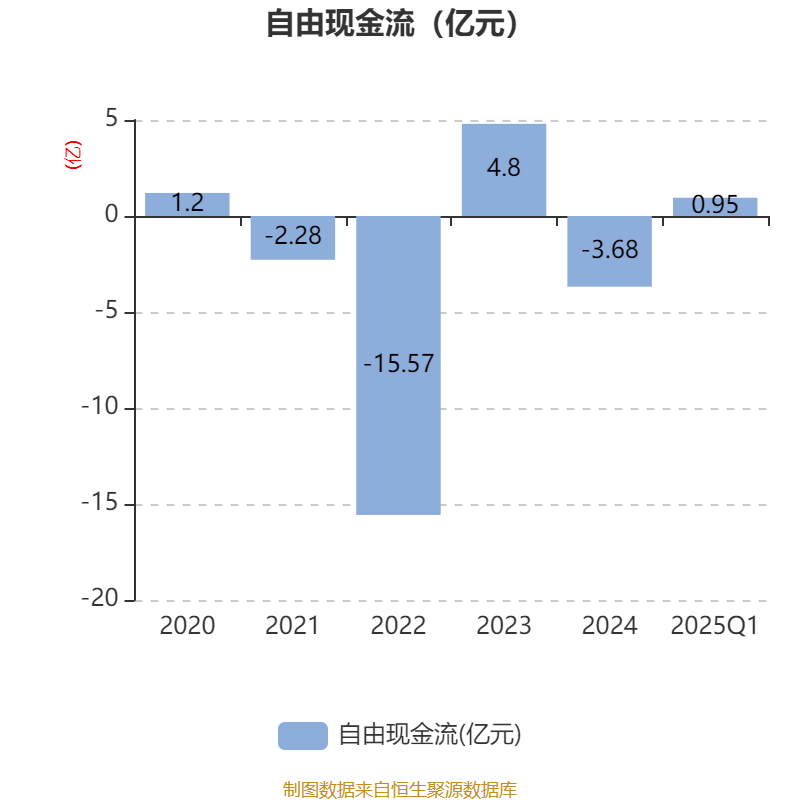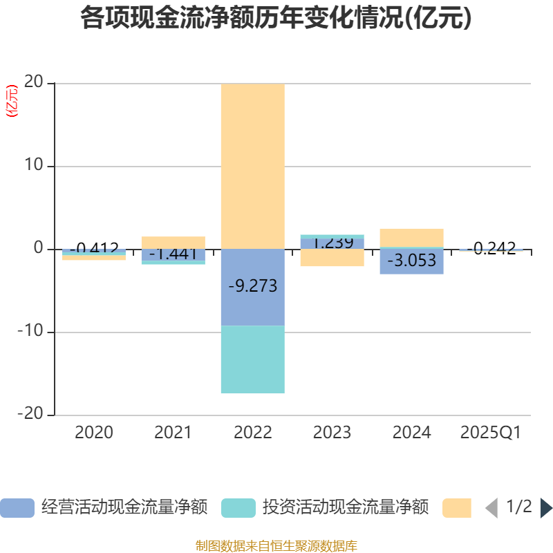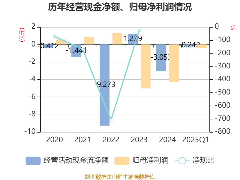 截至2025年一季度末,公司经营活动现金流净额为-2416.72万元,同比增加1.51亿元;筹资活动现金流净额-700.89万元,同比减少1.5亿元;投资活动现金流净额-332.11万元,上年同期为-6768.62万元。