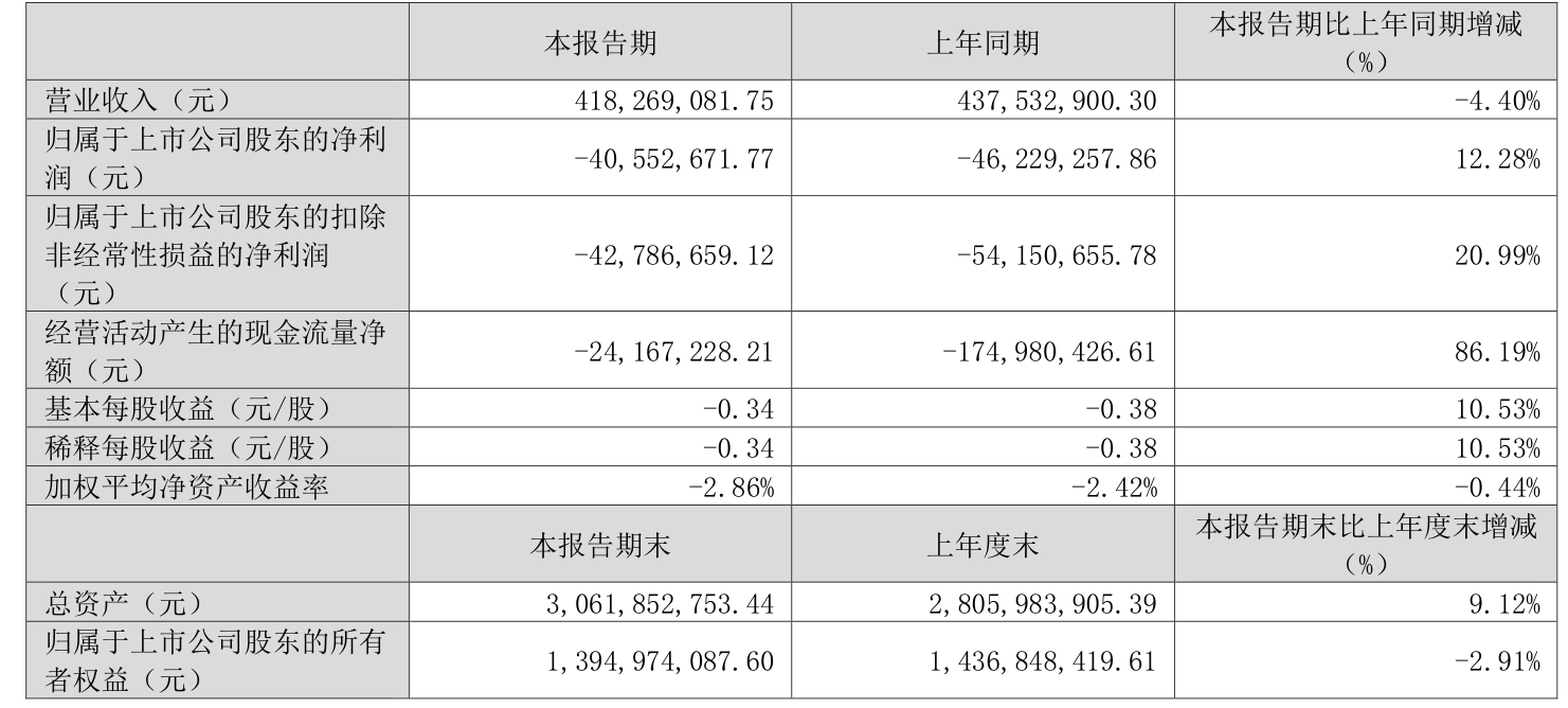 中证智能财讯天力锂能(301152)4月29日披露2025年第一季度报告。公司实现营业总收入4.18亿元,同比下降4.40%;归母净利润亏损4055.27万元,上年同期亏损4622.93万元;扣非净利润亏损4278.67万元,上年同期亏损5415.07万元;经营活动产生的现金流量净额为-2416.72万元,上年同期为-1.75亿元;报告期内,天力锂能基本每股收益为-0.34元,加权平均净资产收益率为-2.86%。