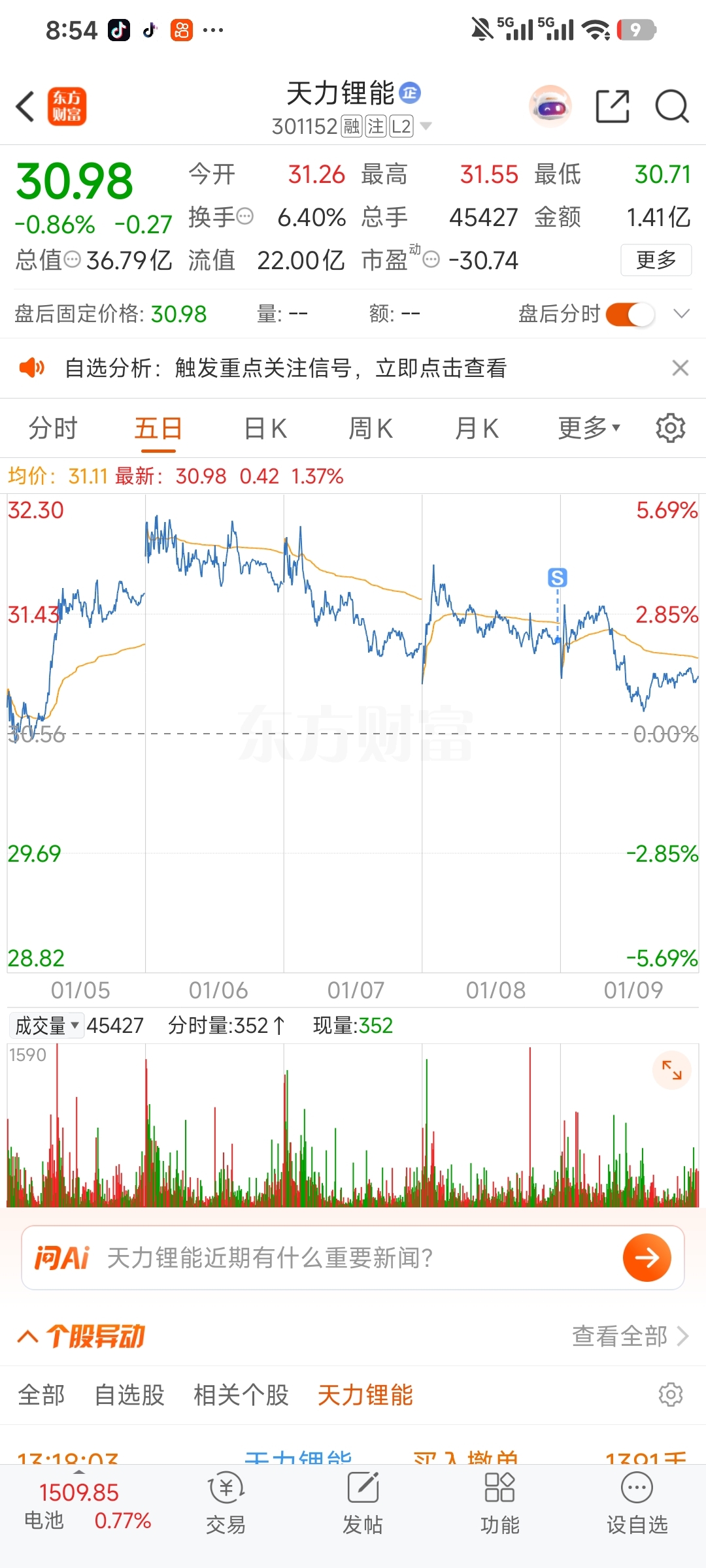 $天力锂能(SZ301152)$ 30再进,这庄就得拉三五个点就卖,卖飞也要卖,绝对是个女的在坐庄,一个多点,两三个点,庄就立马在T。