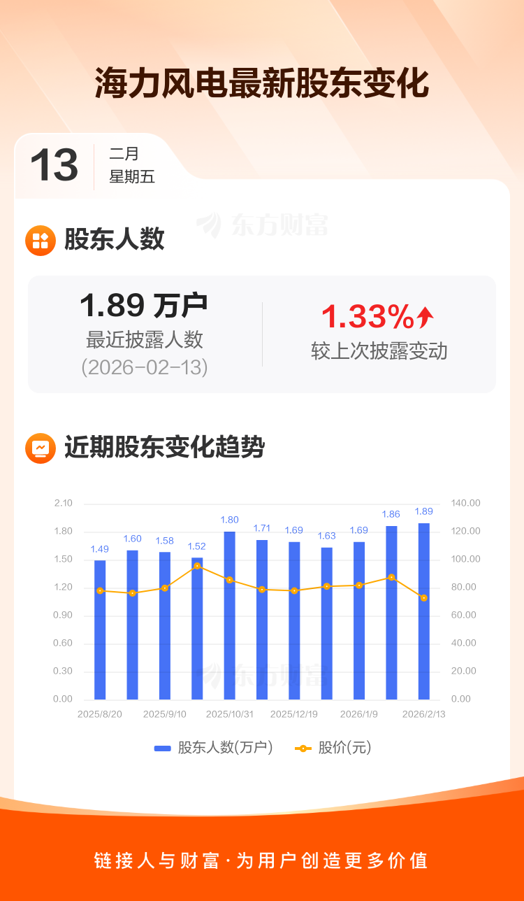 海力风电:截至2月13日最新股东户数1.89万户,较上期增加1.33%
