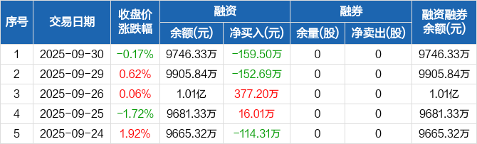 德石股份:融资净偿还159.5万元,融资余额9746.33万元(09-30)