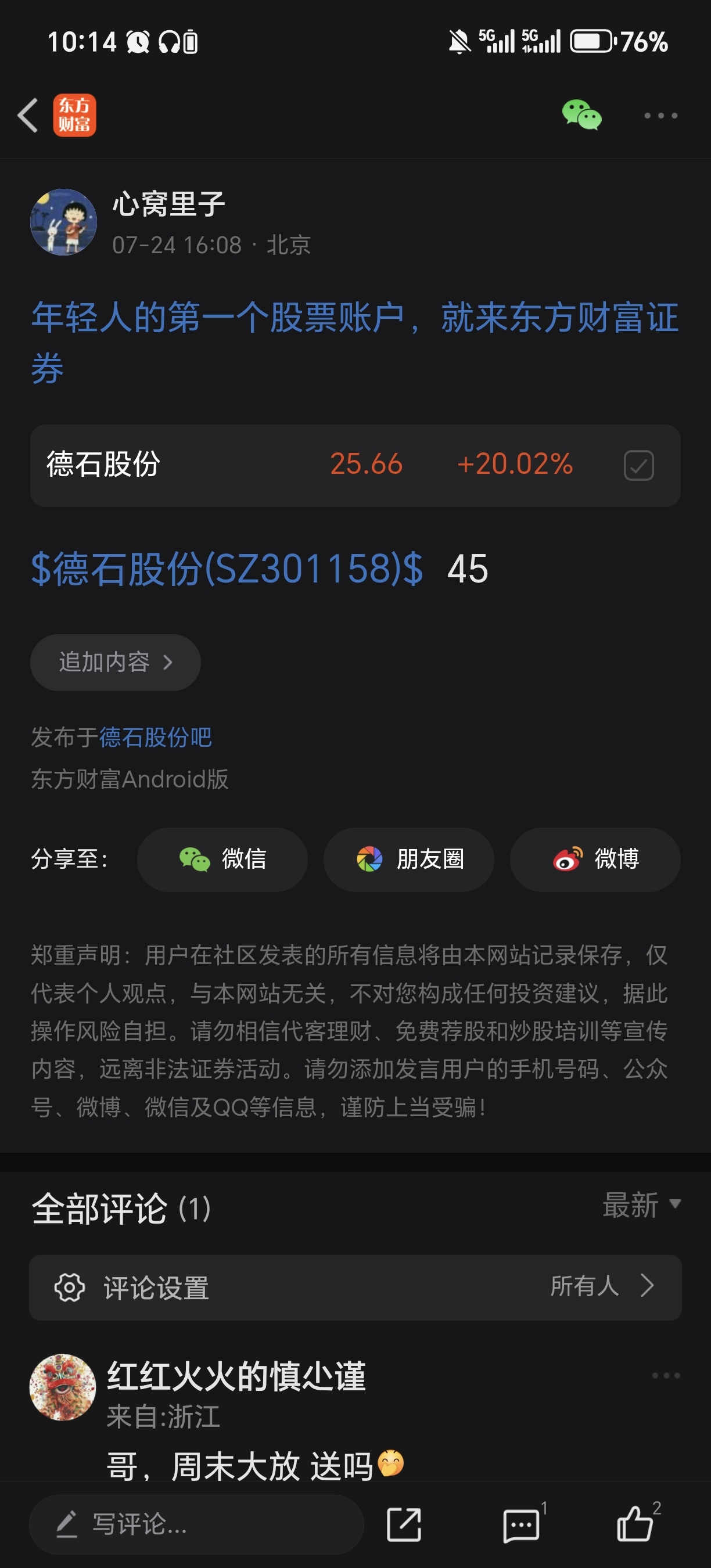 温馨提示: 1.根据《证券法》规定,禁止编造、传播虚假信息或者误导性信息,扰乱证券市场;2.用户在本社区发表的所有资料、言论等仅代表个人观点,与本网站立场无关,不对您构成任何投资建议。用户应基于自己的独立判断,自行决定证券投资并承担相应风险。《东方财富社区管理规定》